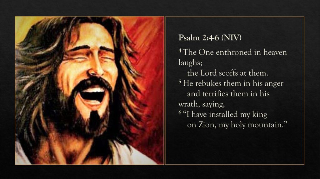 The Psalmist talks about how God looks down from His throne in Heaven at the rebelliousness of men in the earth. “He who sits in the heavens laughs, The Lord scoffs at them” (Psalm 2:4). What happened made me laugh with God in the Spirit as I worshiped and praised him afterward. It still makes me laugh right now. If we can laugh at what goes on down here in the earth, it is only because we have taken our place seated with Christ Jesus in the heavenly places.