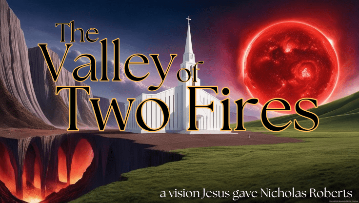There was also a fire at the end of this side of the valley which can only be described as a massive, blazing sun! A wall of fire whose surface curved just enough to discern it was spherical. It was the awe inspiring, all-consuming, fire of God Himself. And it did indeed consume all!