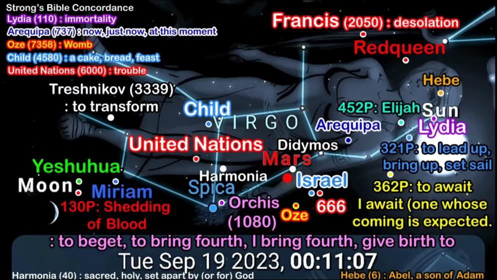 Named asteroids in constellation of Revelation 12 sign during the meeting including; Israel and 666 right next to each other, another named United Nations, another with the first name of the pope, others named or numbered.